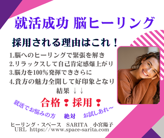 さあ、もう面接は怖くありません!穏やかな雰囲気と優しい表情、これまで以上の自然体のあなたで就活を楽んでください。脳・神経系への癒し、ブレイン・ヒーリングをこの機会に是非ご体験ください。